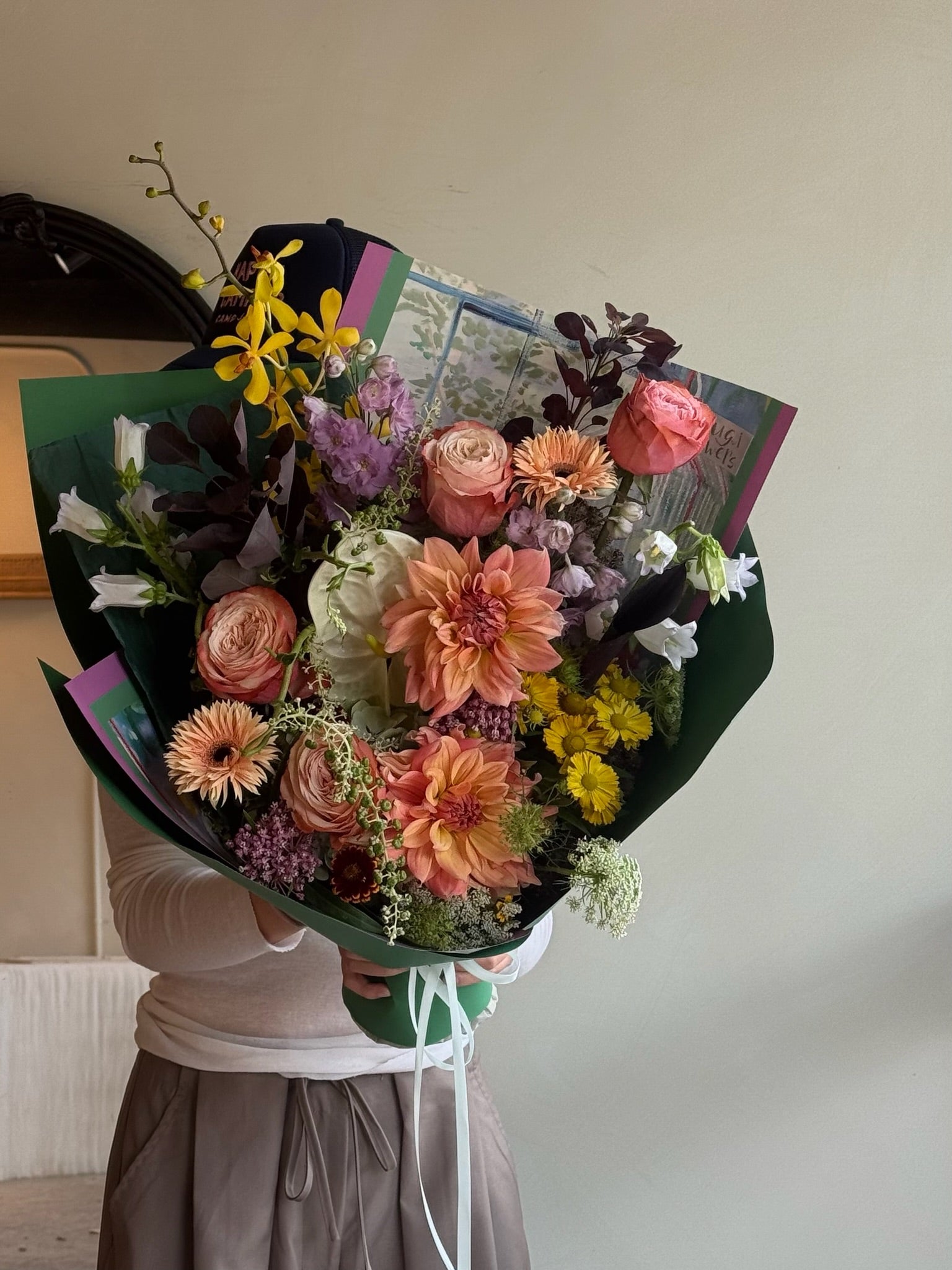 A vibrant bouquet with green and natural color palette.